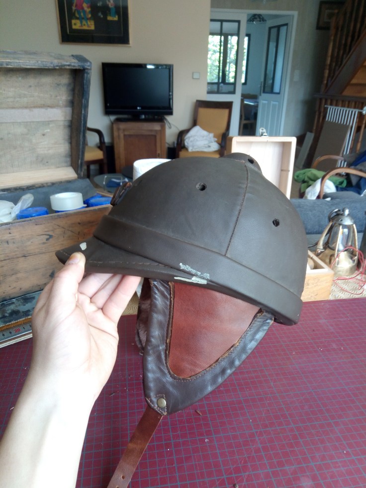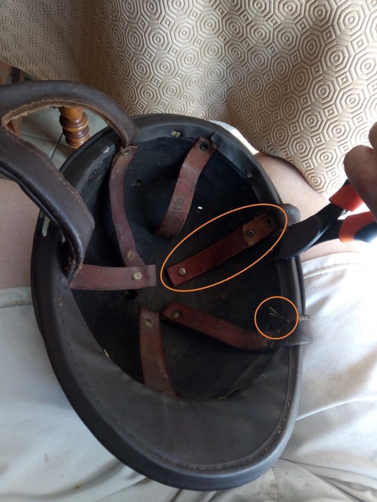 La sangle d’attache fut complètement remplacée par une nouvelle, rivetée, comme la précédente, à la hanse du casque.