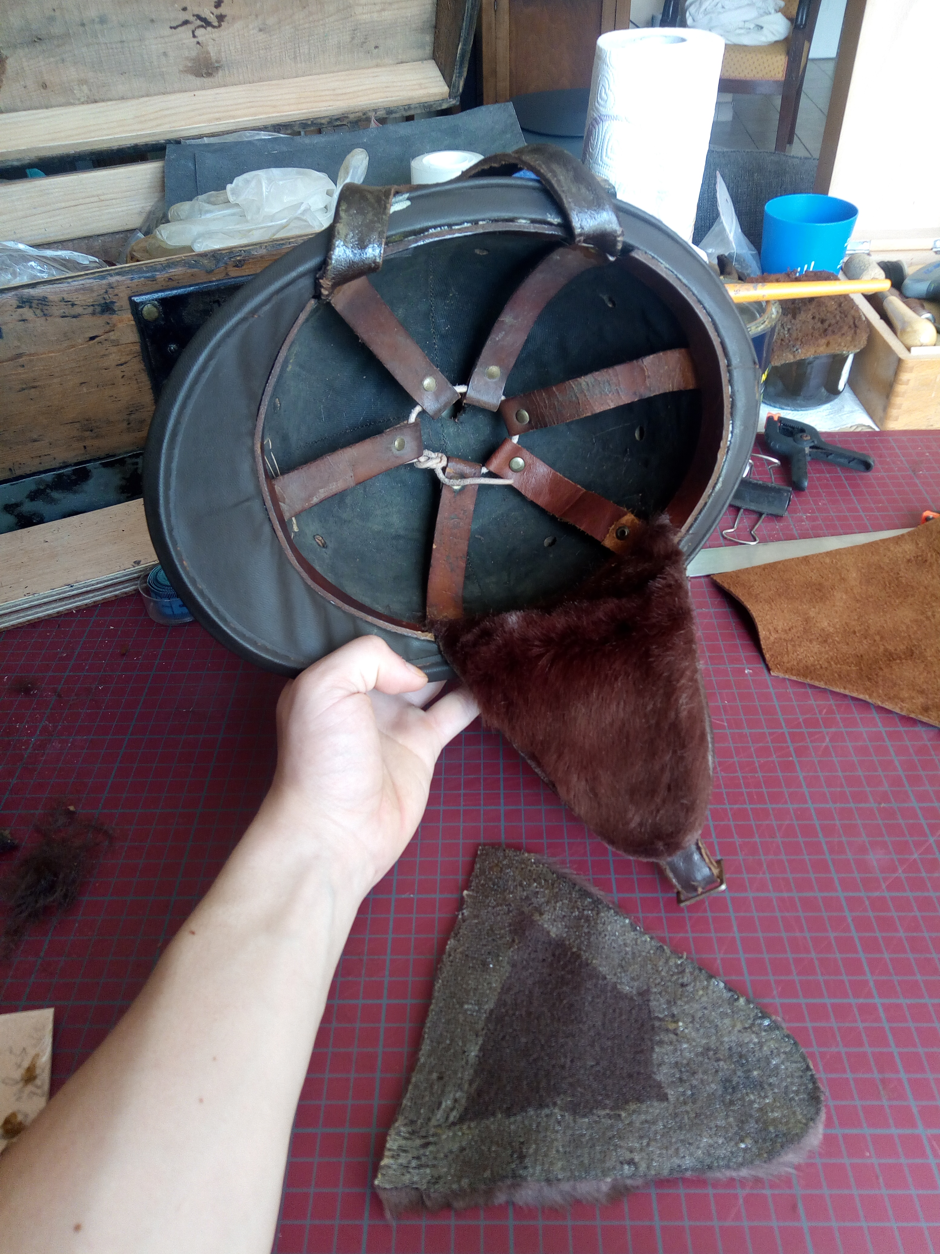 Mon idée était simple. Il s’agissait de rajouter de la fourrure pour donner un aspect protection contre le froid et les deux anses autour des oreilles étaient parfaites pour être comblées. Deux triangles de fourrure peu épaisse furent donc rajoutés vers l’intérieur, collé à la polyuréthane.